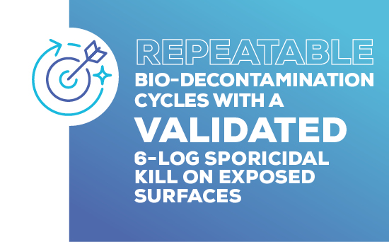 Integrated & automated hydrogen peroxide vapour bio-decontamination for critical areas in your facility. Deliver a bio-decontamination cycle with a 6-log sporicidal kill on exposed surfaces in a single zone or up to 8 selected distribution points. Learn more.