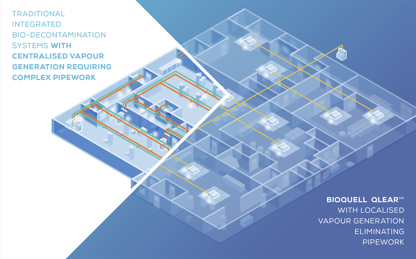 Traditional integrated bio-decontamination systems require centralised vapour generation and either distribution through complex pipework which can take months to install, or distribution through HVAC ducting which can result in variability in coverage leading to cycle failures.